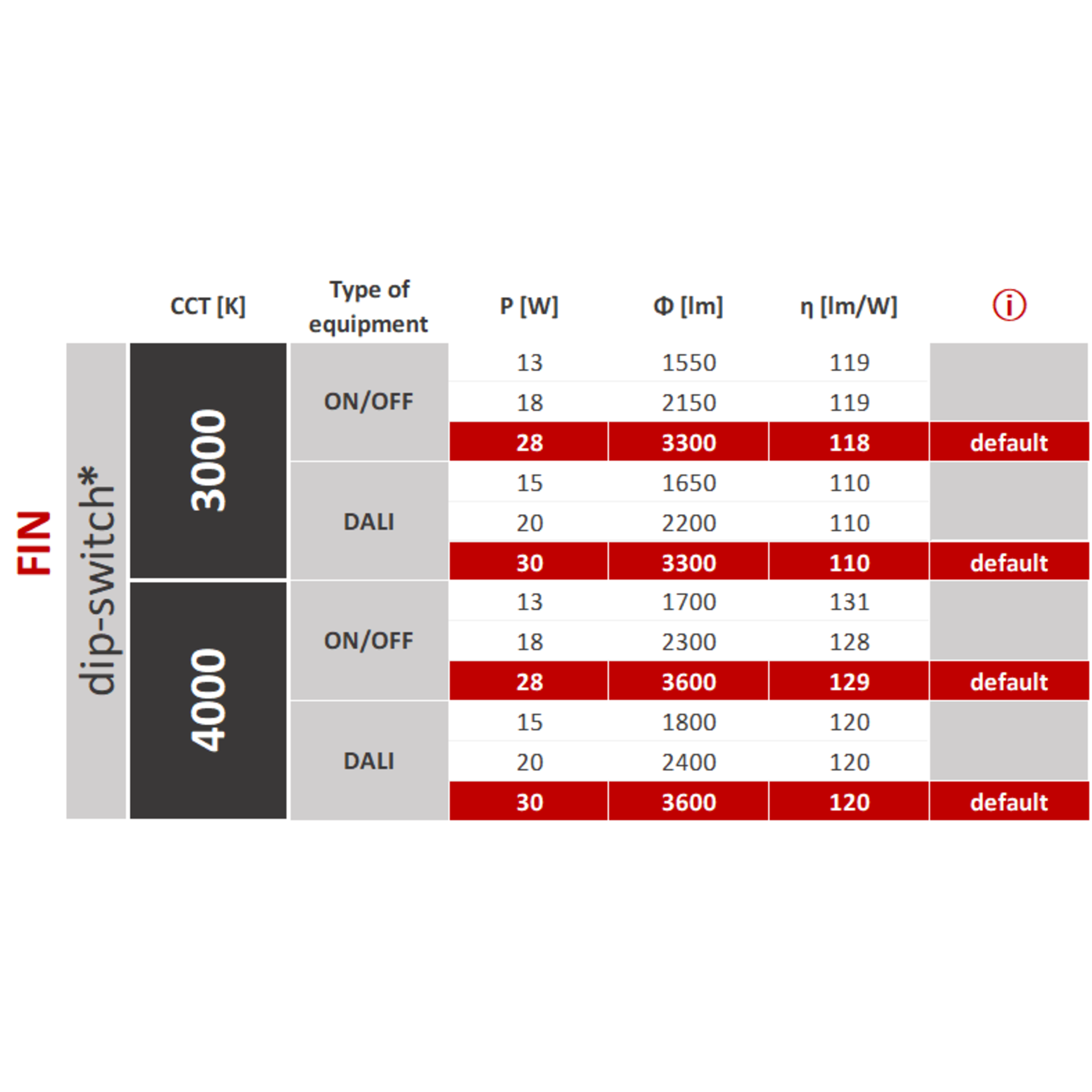 | Confronto | Codice | Colore dell'apparecchio | Tipo di accessorio | Angolo di emissione luminosa | Potenza della plafoniera [W] | Flusso luminoso della plafoniera [lm] | Efficienza luminosa [lm/W] | Temperatura di colore [K] | CRI/Ra | Campo di temperatura d'esercizio [°C] |