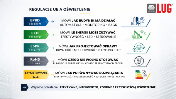 Wyznacza wiążące cele redukcji zużycia energii do 2030 roku. Dla rynku oświetleniowego to sygnał do natychmiastowej modernizacji na technologię LED oraz projektowania inwestycji w oparciu o wskaźnik LCC (Life Cycle Cost), czyli całkowity koszt posiadania, a nie tylko cenę zakupu.