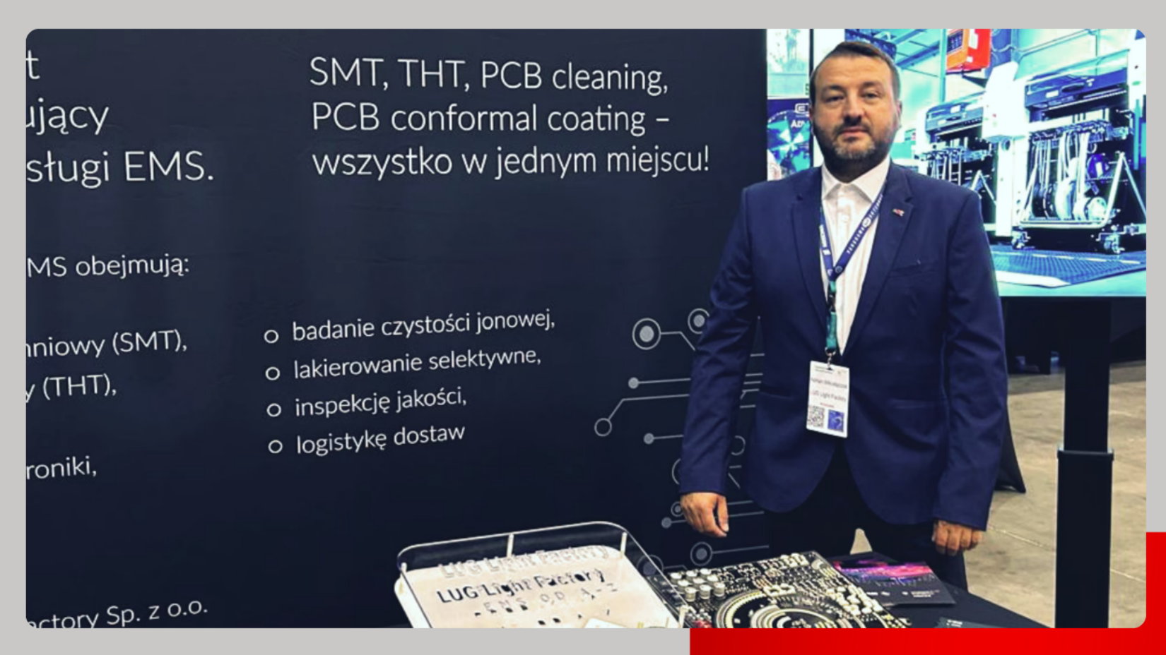 Podczas targów zaprezentowaliśmy m.in. nasze możliwości w zakresie montażu komponentów, zabezpieczania elektroniki przed wilgocią i promieniowaniem UV, czyszczenia płytek PCB oraz kontroli czystości jonowej – wszystko to, co wpływa na niezawodność i trwałość produktów.