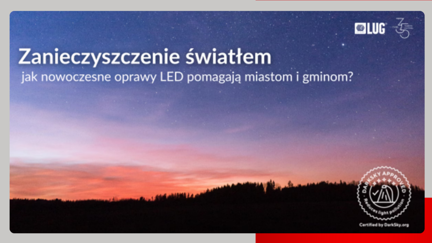 W LUG przykładamy szczególną wagę do tego, aby nasze oprawy spełniały międzynarodowe standardy jakości. Dlatego oferujemy rozwiązania z certyfikatem DarkSky Approved – gwarancją, że światło emitowane przez oprawę jest przyjazne dla środowiska i nie zakłóca naturalnego rytmu nocy. Certyfikaty DarkSky są coraz częściej uznawane na świecie za punkt odniesienia w projektowaniu oświetlenia miejskiego. Wierzymy, że w przyszłości również w Polsce będą standardem, a my już dziś dostarczamy produkty, które wpisują się w te wymagania.